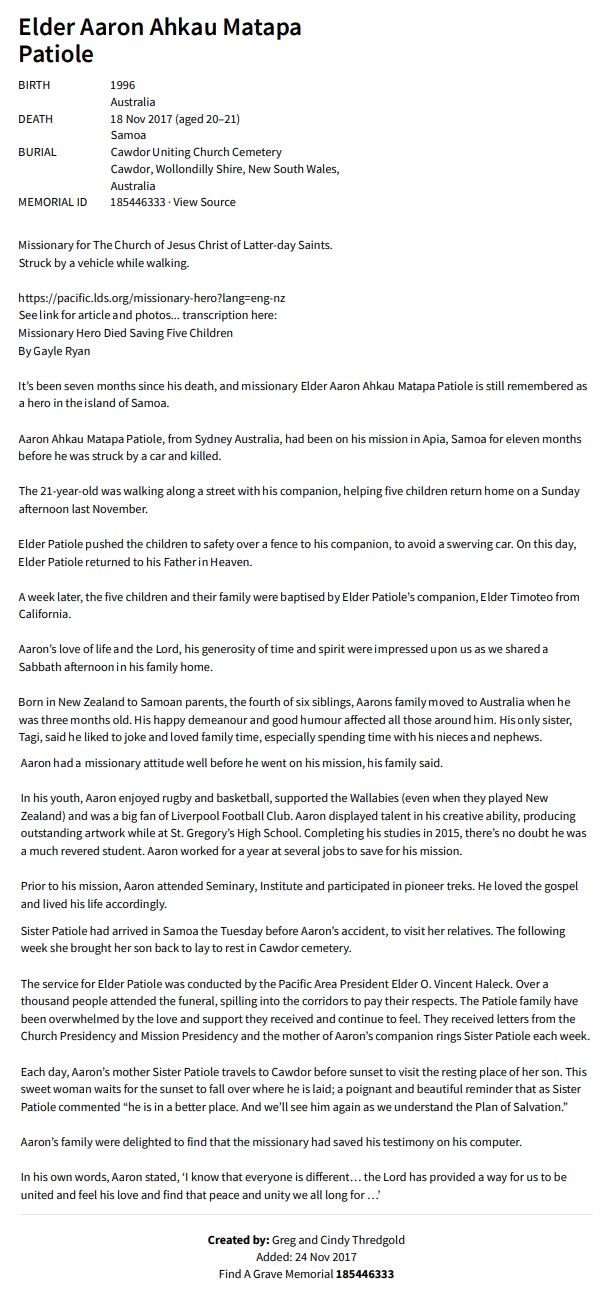 Sierra Leone | Malaria | 19 | Vailima, Samoa | |
